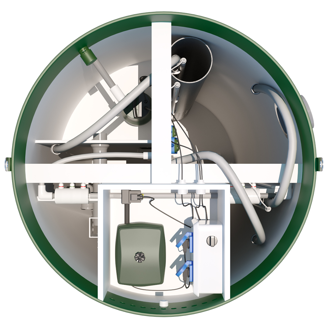 Распределительно-регулировочный узел размещён на внешней стороне стенки камеры с компрессорами. Из него идут воздуховоды к каждому потребителю станции автономной канализации.